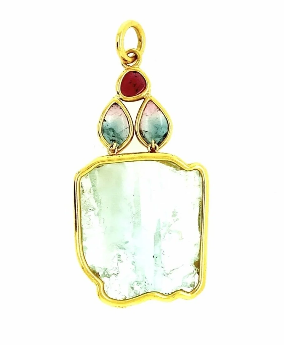 a chunky rough aquamarine crystal, suspended by a tourmaline and garnet cabochon gradient