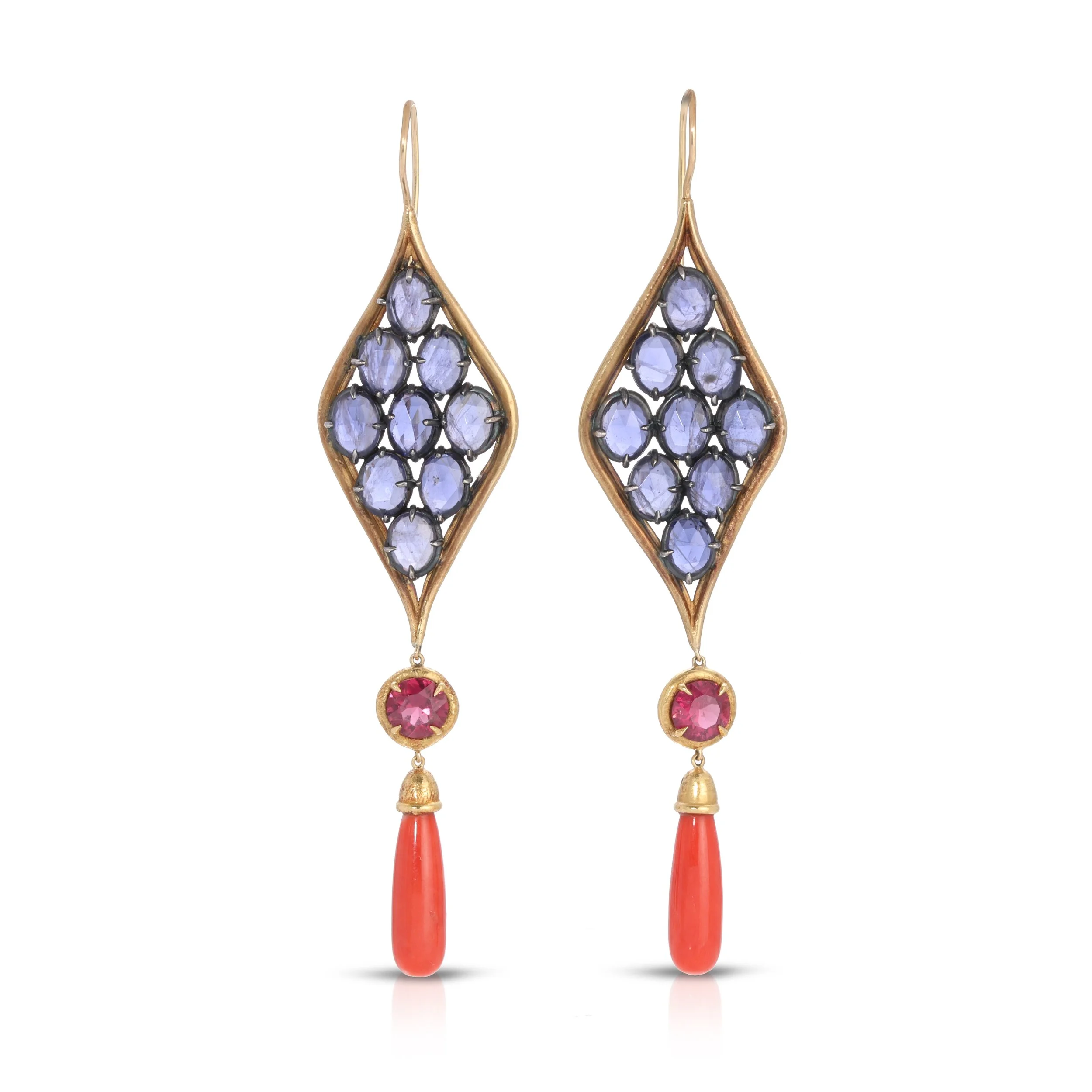 iolite : 18 oval rosecuts, 16 tcw rhodolite : 2 · 6.8 mm brilliants coral : 2 · 20 mm drops |