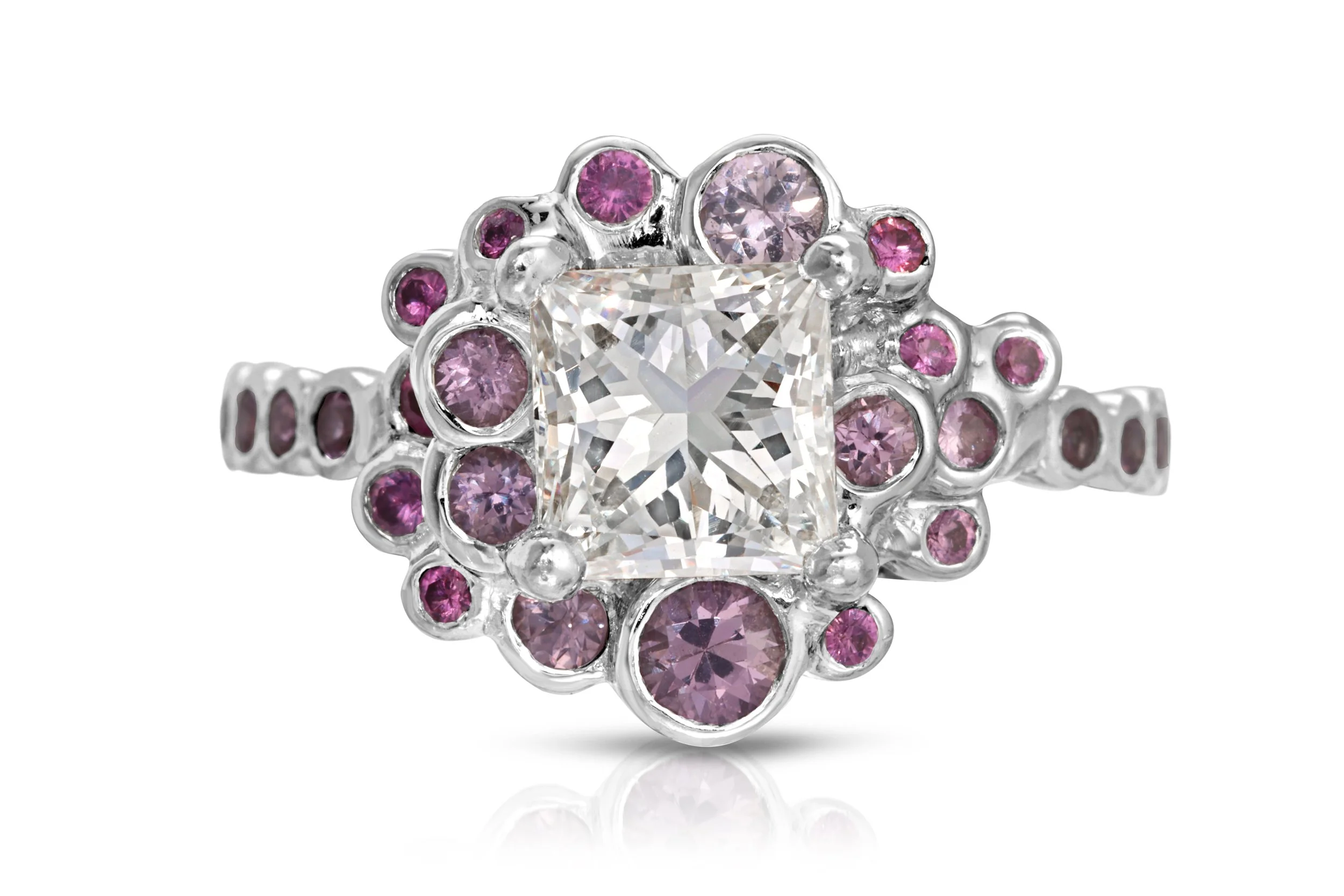 custom-made platinum ring featuring pink sapphires in a variety of sizes and shades and customer’s princess-cut diamond