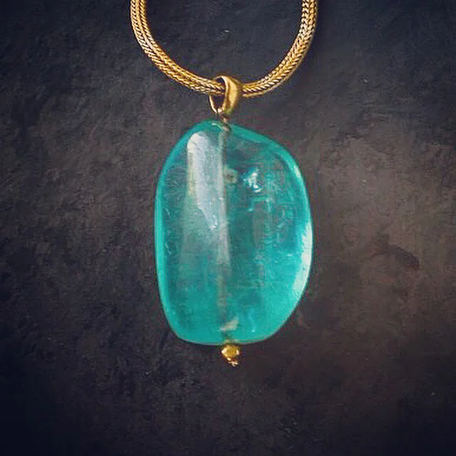 intensely colored tumbled aquamarine bead suspended from a hand carved hidden hinge bale